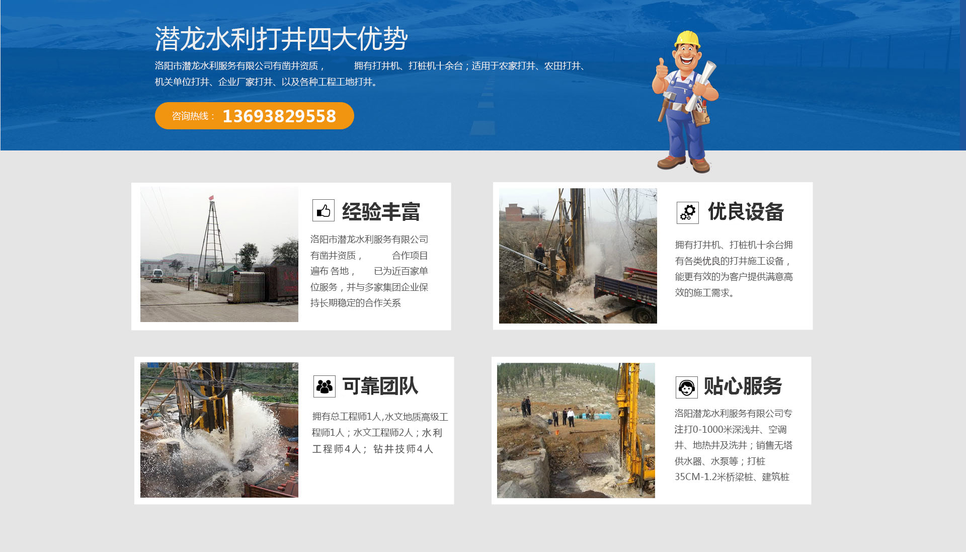 洛陽市潛龍水利服務(wù)有限公司成立于2009年,注冊資金200萬元,擁有河南省水井供水技術(shù)協(xié)會頒發(fā)的河南省水井施工單位壹級資質(zhì)證書,公司擁有打井機、打樁機十余臺;適用于農(nóng)家打井、農(nóng)田打井、機關(guān)單位打井、企業(yè)廠家打井、以及各種工程工地打井。洛陽潛龍水利服務(wù)有限公司打0-1000米深淺井、空調(diào)井、地?zé)峋跋淳讳N售無塔供水器、水泵等;打樁35CM-1.2米橋梁樁、建筑樁等;代辦洗井業(yè)務(wù);農(nóng)業(yè)水利灌溉,土地開發(fā)整理項目可行性研究、編制、規(guī)劃、設(shè)計、預(yù)算編制、標(biāo)書編制、水利技術(shù)咨詢服務(wù)。